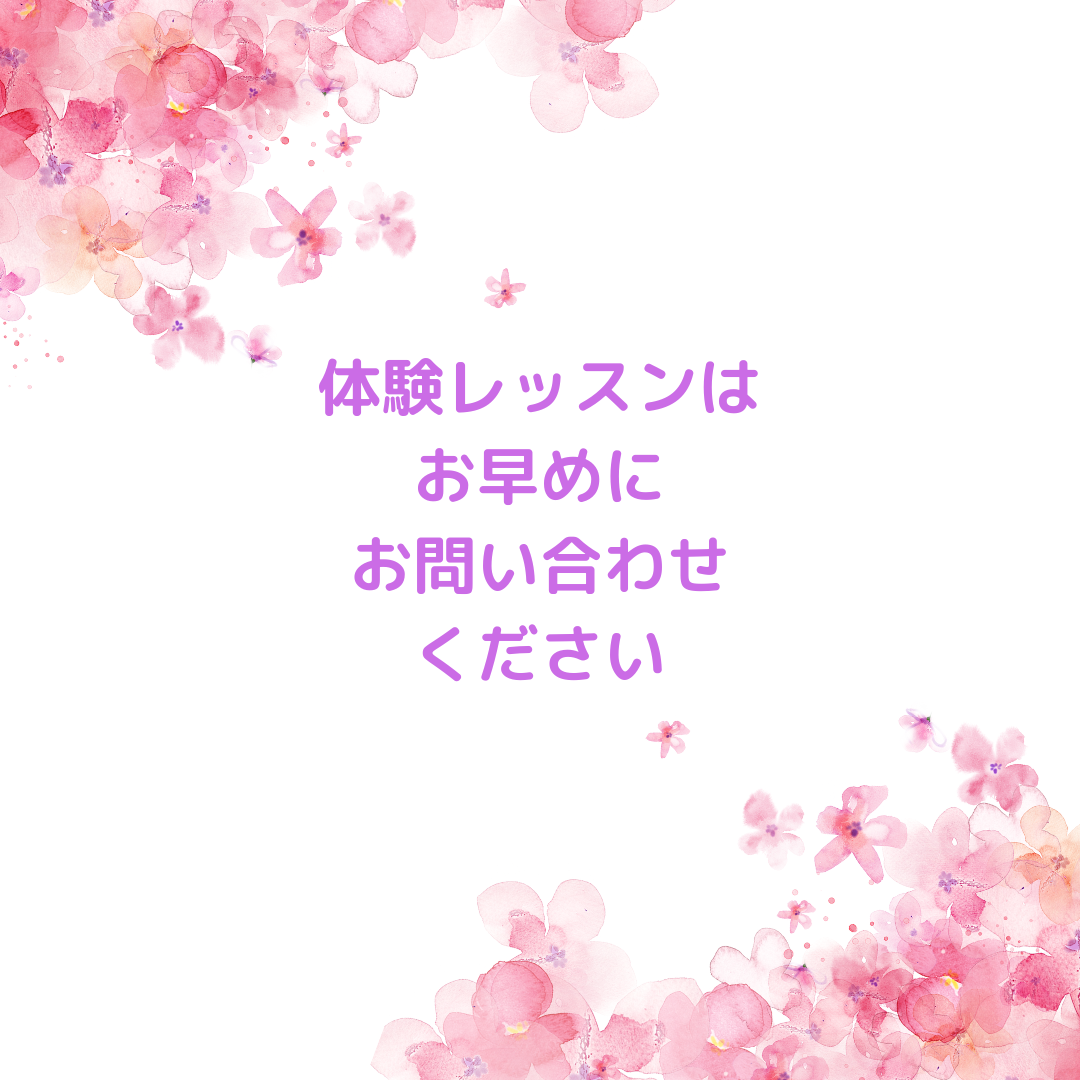 あと2枠 2026/02/21 下島教室 水曜日19:00〜 土曜日15:00〜 14:00〜 14:30〜の時間帯は相談に応じます 無料体験レッスンのお問い合わせは、電話ではお断りしています お手数ですが、メールでお願い致します